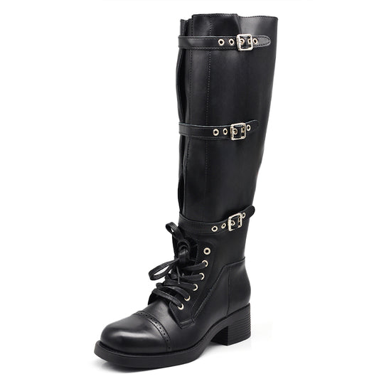 Anfibi Stivali alti al ginocchio da donna con tripla fibbia lacci punta squadrata XT1 nero