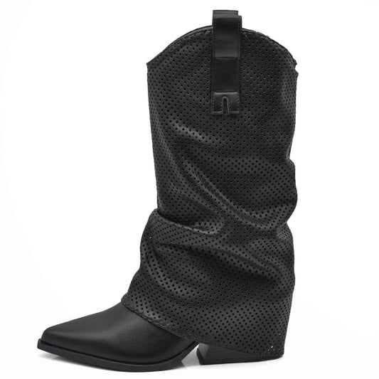 Stivaletti Arricciati Texani Donna con Decorazione Esterna Traforata e Tacco Medio – Stivali Western