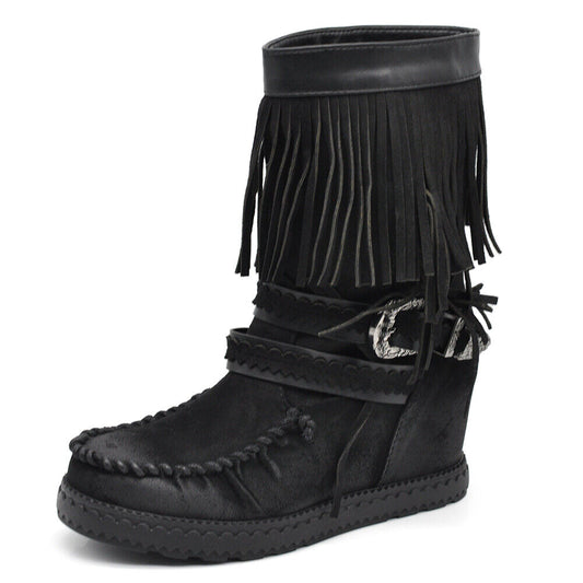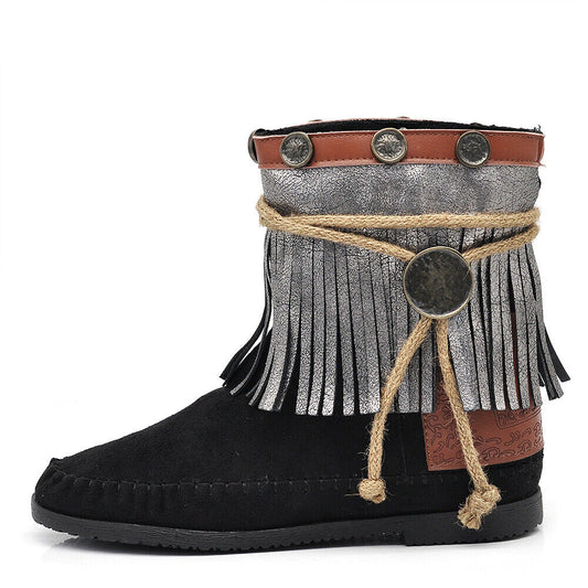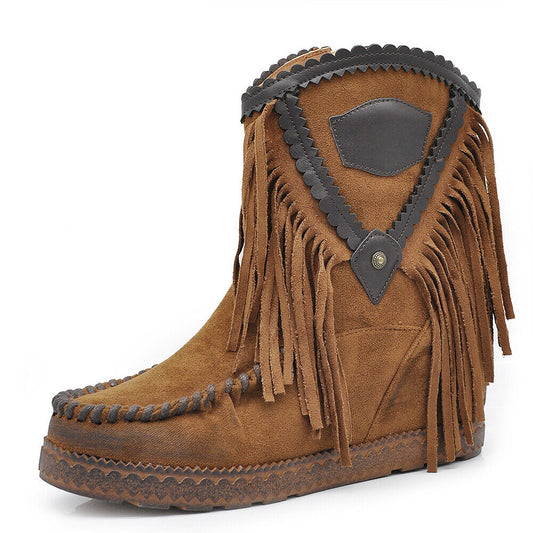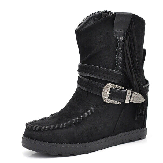 Stivali Stivaletti Indianini Da Donna Fibbia Zeppa Scamosciato Frange 9669