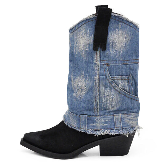 Stivali Texani Arricciati Da Donna A Punta Con Tacco Ghetta Risvolto Jeans 6657