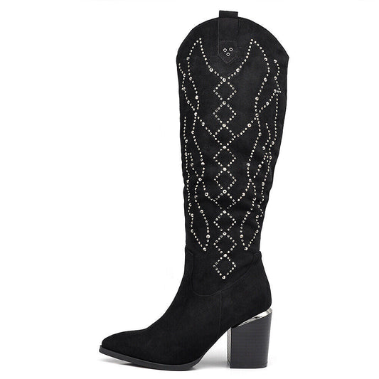 Stivali Texani Camperos Scamosciati Con Strass Tacco Da Donna Elegante XG109