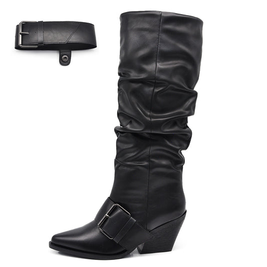 Stivali Texani Western alti donna con punta affusolata e gambale arricciato tacco a cono e cinturino largo rimovibile GA043 nero