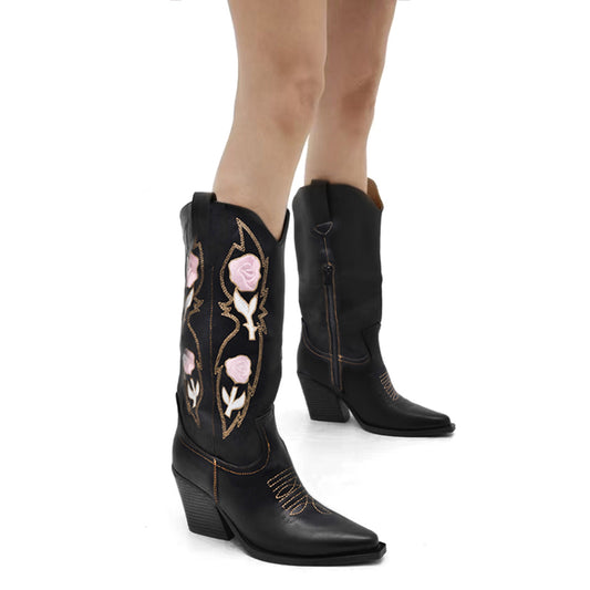 Stivali Texani Donna con Ricamo Floreale Tacco Largo Punta a Mandorla Stivaletti Western MP736-12
