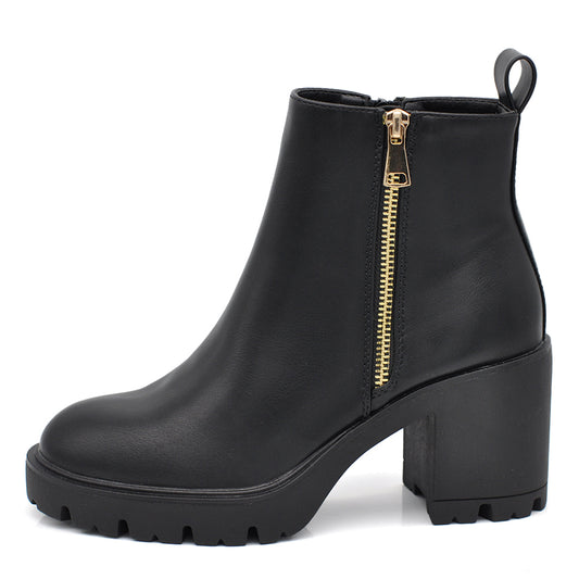 Stivaletti da donna con cerniera decorativa tronchetti tacco medio largo platform carrarmato BT24182 nero