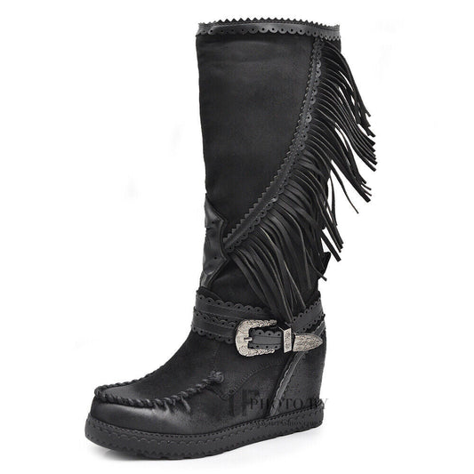 Stivali Indianini Da Donna Al Ginocchio Borcie Fibbie Frange Zeppa iNTERNA 9660