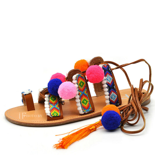 Scarpe Sandali Da Donna Schiava Ibiza Pom Pom Bohémien Frange Colorate IF1317