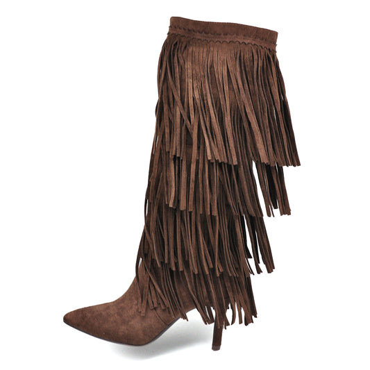 Stivali alti con 3 strati di frange in stile western a punta e tacco a spillo camoscio sintetico GA049