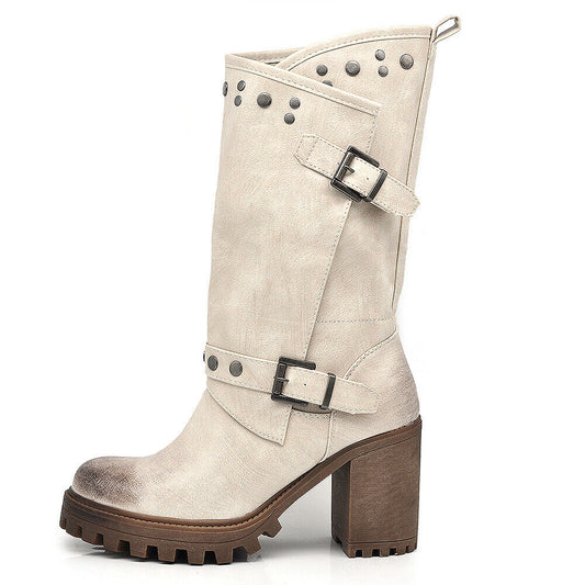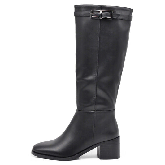Stivali Alti Polpaccio Da Donna Tacco Medio Grosso Fibbia Cinghia XG107