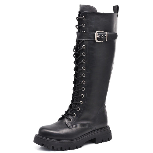 Anfibi Stivali alti al ginocchio da donna con tripla fibbia lacci punta squadrata XT1 nero