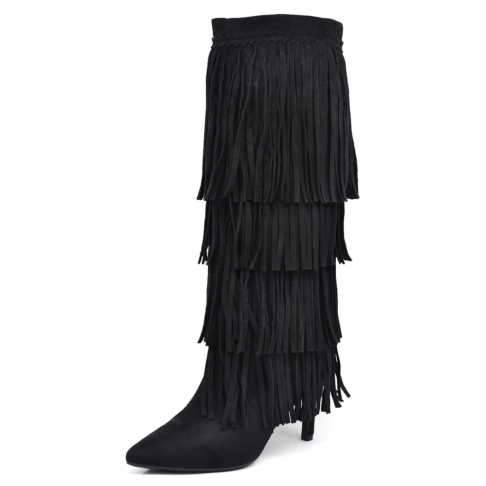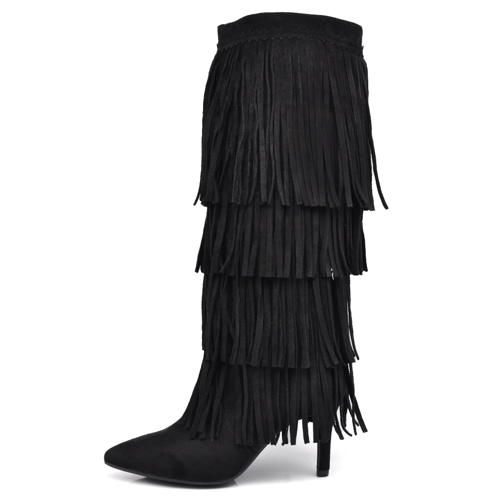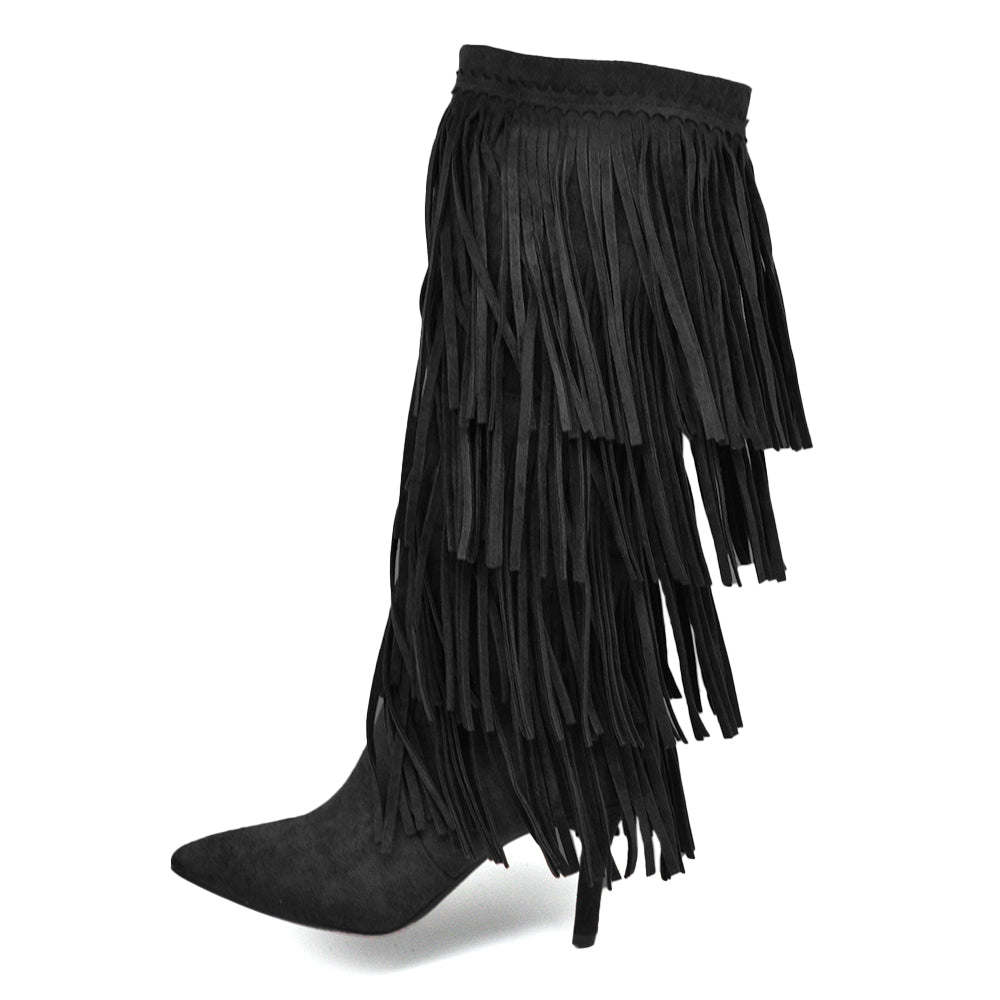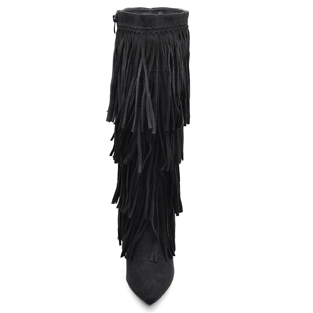 Stivali alti con 3 strati di frange in stile western a punta e tacco a spillo camoscio sintetico GA049