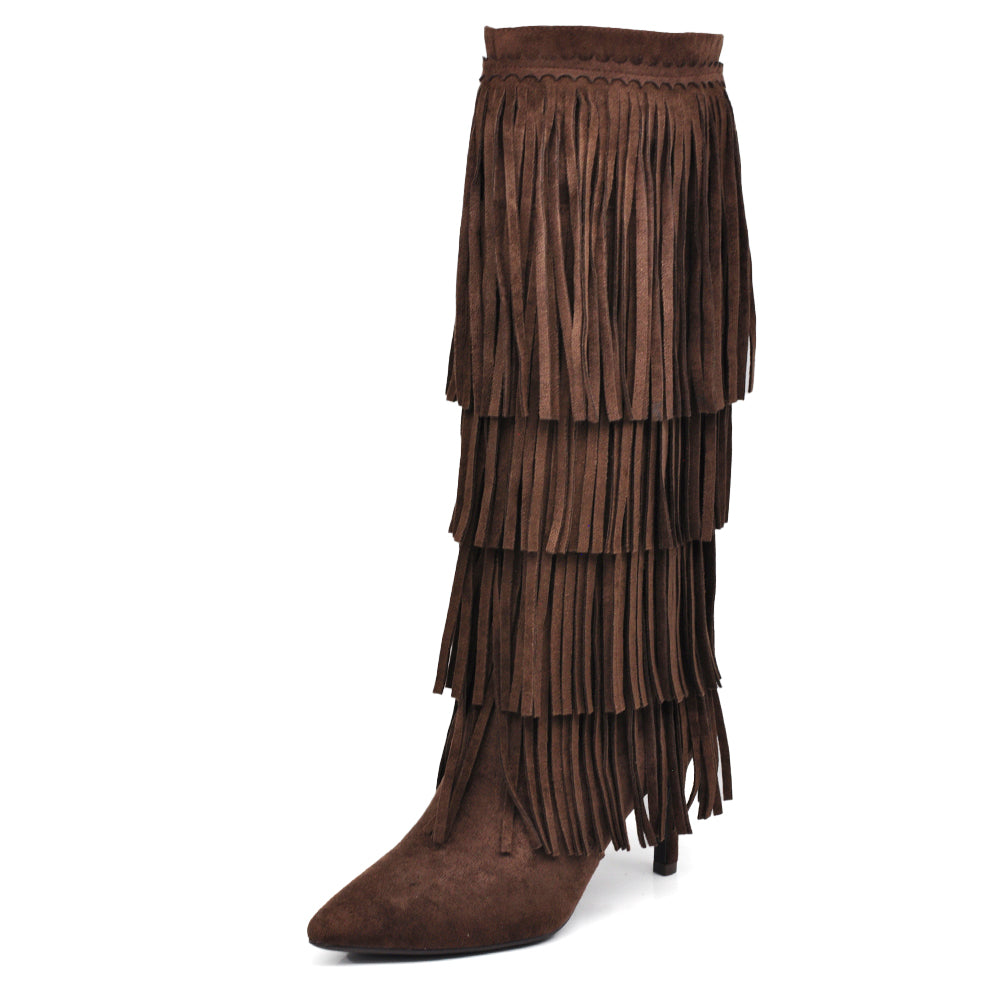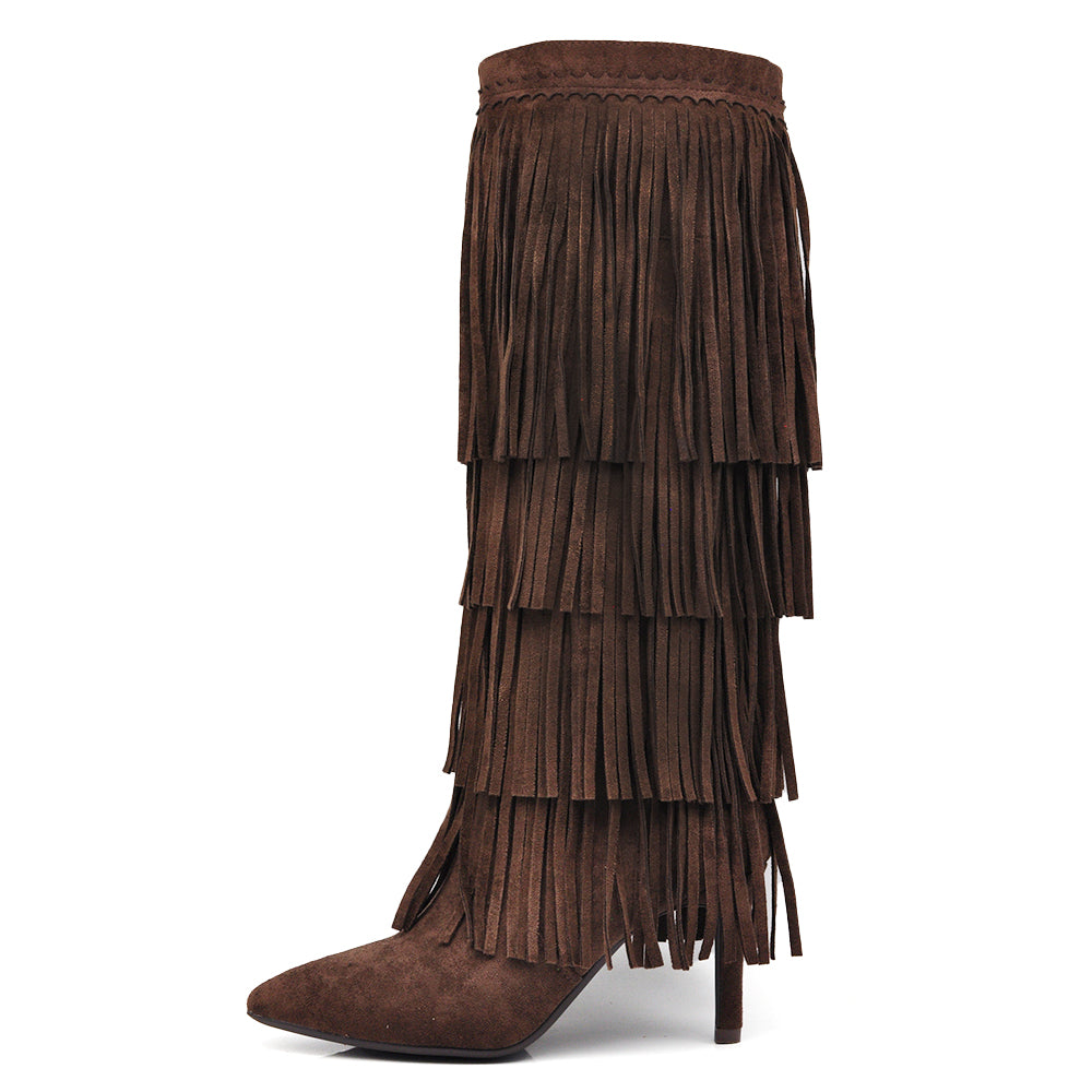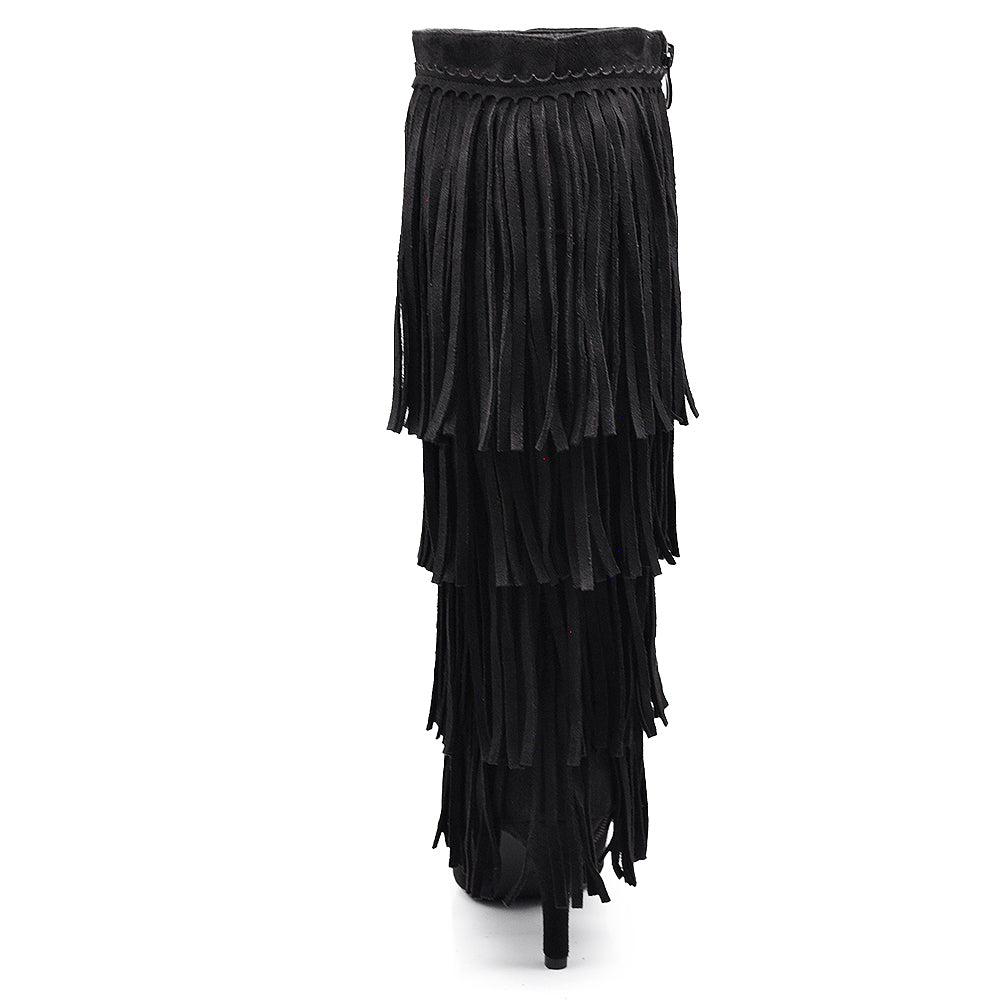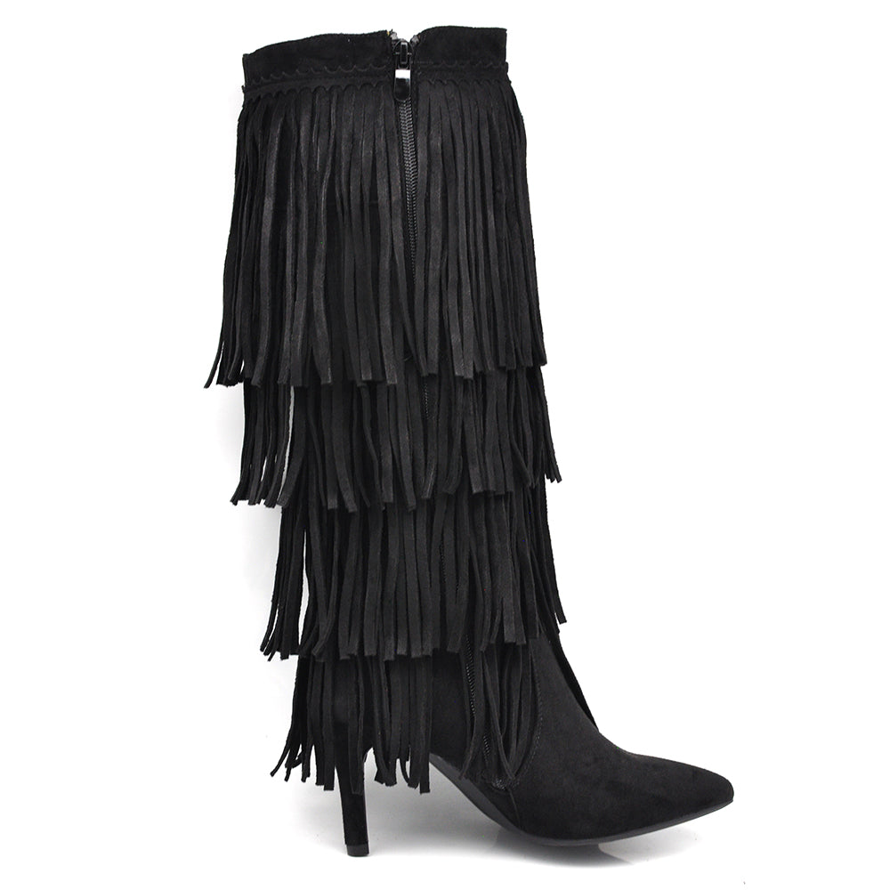 Stivali alti con 3 strati di frange in stile western a punta e tacco a spillo camoscio sintetico GA049