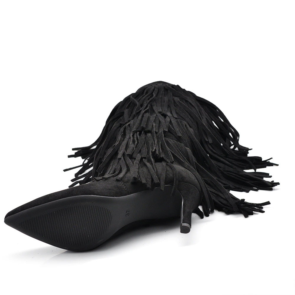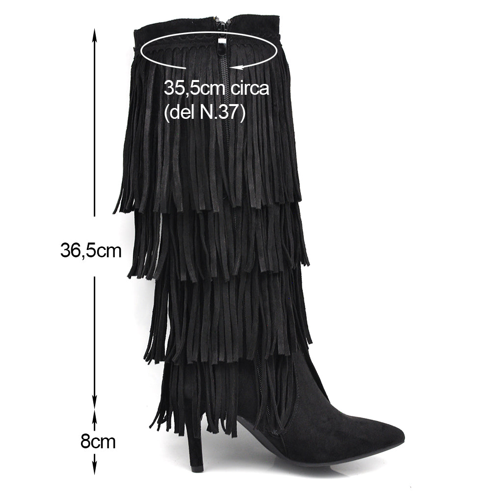 - Descrizione: Stivali eleganti con frange a più strati dallo stile western-chic, perfetti per aggiungere un tocco originale e glamour ai tuoi outfit. La punta affusolata e il tacco sottile donano femminilità e slancio alla silhouette, mentre le frange creano movimento e carattere in ogni passo. Ideali da abbinare sia a look casual con jeans che ad abiti per un effetto più audace.