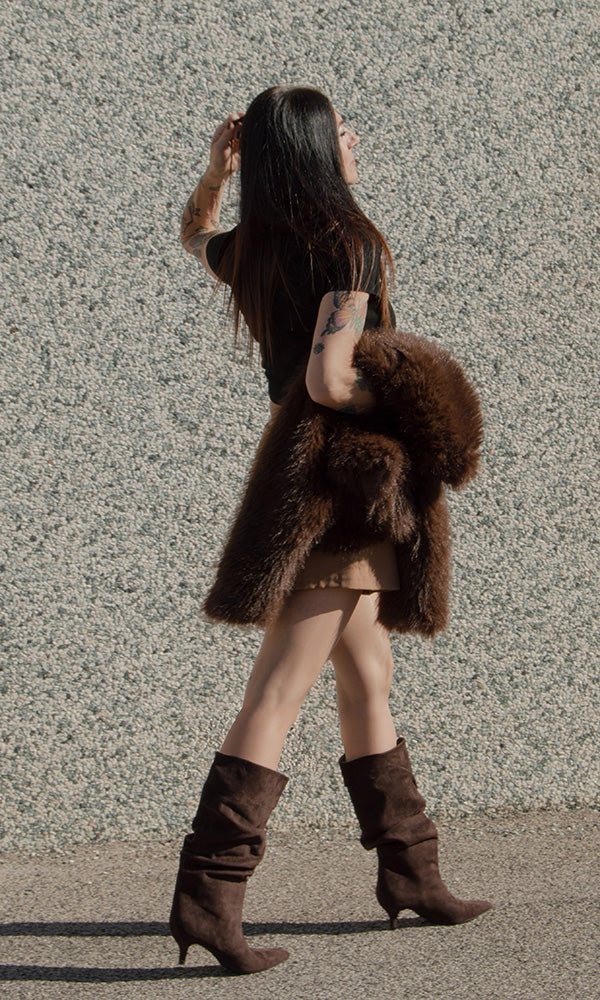 Stivali al polpaccio da donna scamosciato con tacco basso a spillo gattina KITTEN HEELS arricciato elegante e confortevole A206 marrone beige
