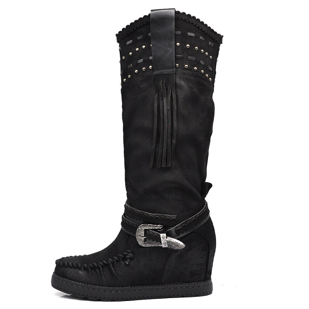 Stivali Indianini Da Donna Al Ginocchio Frange borcie Fibbie Zeppa Interna 9668