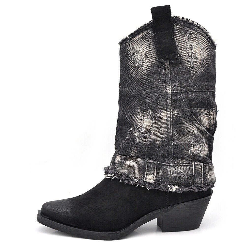 Stivali Texani Arricciati Da Donna A Punta Con Tacco Ghetta Risvolto Jeans 6657